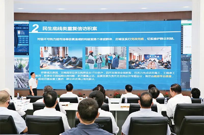 开展治理重复信访、化解信访积案工作,是推进解决信访突出问题、维护群众合法权益的重要举措。近年来,各地区各部门坚持问题导向、目标导向、结果导向,坚持治标与治本并重,最大限度减少问题产生和积累。2021年5月24日至25日,中央信访工作联席会议在山东省济南市召开“治理重复信访、化解信访积案”经验交流暨工作推进会。图为与会人员参观济南市历城区社会矛盾多元调处化解中心,了解信访积案化解情况。国家信访局供图